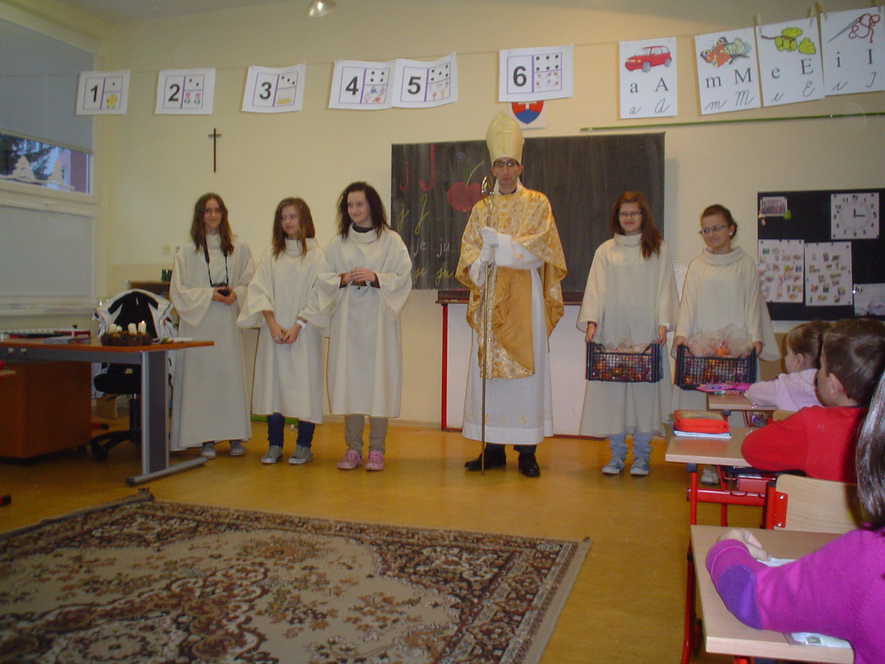 6.12. 2012 prišiel medzi nás Sv. Mikuláš. V našej škole, sme ho zažili prvý krát. So svojimi pomocníkmi nám rozdal sladkosti. Našťastie čerti sa v triede iba porozhliadli a nikoho do vreca nezobrali. Anjeli s nami pobudli dlhšiu chvíľu.